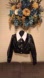 Chic black leather jacket. Features a bold white collar and buttons. Ideal for a sleek, modern style.