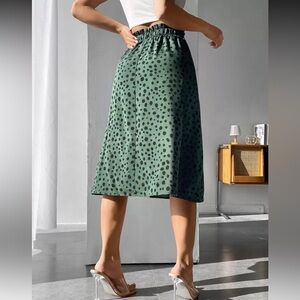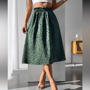 Chic and comfortable, this SHEIN paper bag waist midi skirt features a playful green-and-black polka dot pattern.