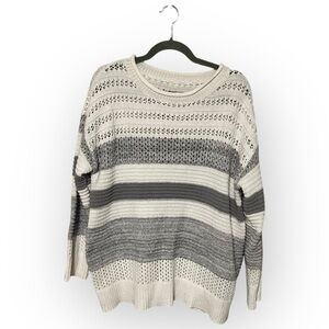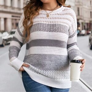 Stay cozy and stylish with this striped gray and white sweater. Perfect for any casual outing.