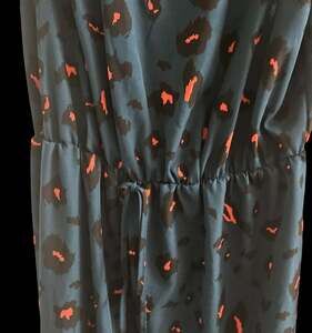 SHEIN LUNE Leopard Print Tie Front Fake Button Dress. This dress features a vibrant leopard print in black and orange on a teal background. It has a V-neckline, a tie front detail at the waist for an adjustable fit, and a fake button-down front, maintaining a continuous print. The sleeveless design and lightweight fabric make it suitable for warmer weather or layering. Excellent pre-loved condition, no visible flaws.