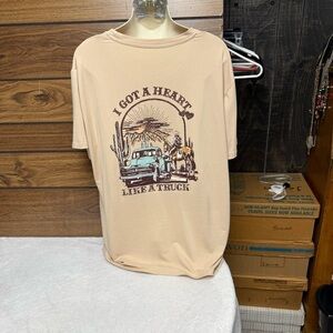 This tan short sleeve tee features a relaxed fit and a classic crew neckline, crafted from soft cotton for everyday comfort. Heart Like A Truck on the back and small subtle graphic design on the chest adds a touch of style to this versatile piece, perfect for casual outings.