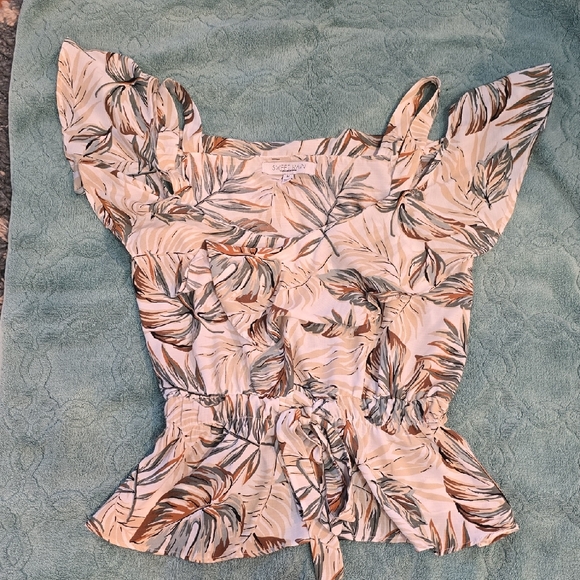 Chic blouse with leaf pattern. Features ruffle sleeves and tie waist. Ideal for casual outings.