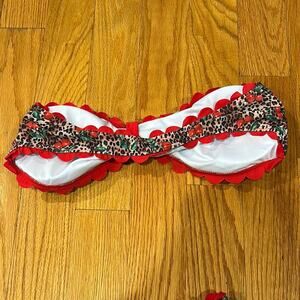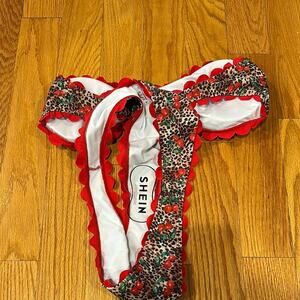 Stylish leopard print bikini with cherry accents. Features red scalloped trim. Perfect for a bold beach look.