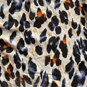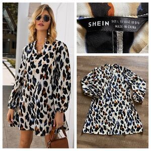 SHEIN leopard print long sleeve dress with notched v-neck collar. Banded cuffs created a bit of volume in to sleeves. Also allows versatility to adjust the sleeve length by pulling them up the arm if desired. Please see photo section for approximate flat measurements. Note: the material tag has been removed but is an airy/flowy fabric.