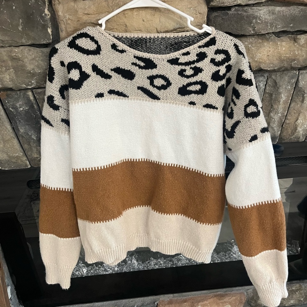 Stylish sweater with leopard pattern and color block design. Features black, white, and brown tones. Perfect for casual wear.
