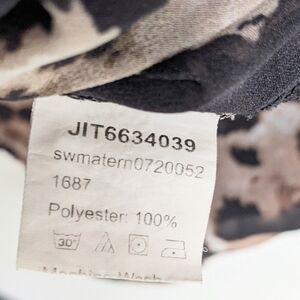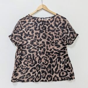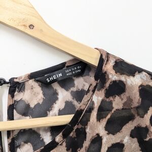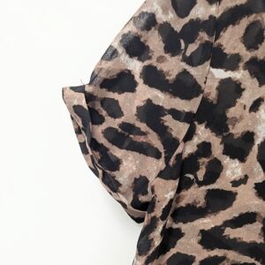 This women's size M (US 6/EU 38), SHEIN blouse features a chic tan/black, semi sheer leopard print with short cuffed sleeves, scoop neck, peek-a-boo button closure in the back and a boxy silhouette, perfect for a casual yet stylish look. The top is designed with a relaxed fit, making it a versatile addition to any wardrobe. 100% Polyester. Measures approx. 20" Pit-to-Pit & 23 1/2" Shoulder-to-Hem.