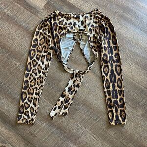 Super sexy long sleeve leopard print wrap crop top from SHEIN. Low cut with metal O-ring in front, open back with adjustable wrap ties. Very sexy party/festival top. Stretchy smooth material. Size small {US 4}. Please see photo section for my model stats for fit reference. Material: 100% polyester.