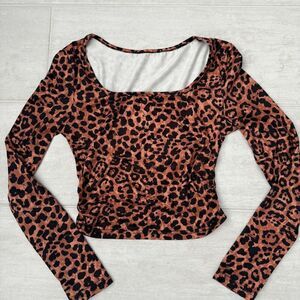 SHEIN Long Sleeve Crop Top Leopard Animal Print Side Ruching Scoop Neck XS
