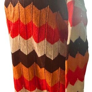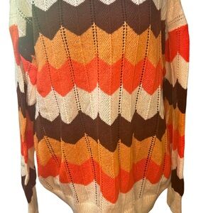 Stay cozy and stylish with this vibrant chevron crochet patterned sweater. Featuring a blend of cream, orange, red, and brown, this piece adds a pop of color to any wardrobe. Perfect for layering or wearing on its own. New With Tags Size Large