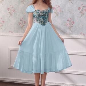 Fairytale meets modern chic โ this SHEIN MOD corset dress in soft baby blue crepe has a floral brocade bustier, lace-up sides, and a ruffled midi skirt for a perfectly romantic, vintage-inspired silhouette. Ideal for holiday parties, date nights, or bridesmaid looks this season!