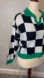 Stylish checkered sweater featuring a bold black and white pattern with green accents. Perfect for adding a pop of color to your wardrobe.