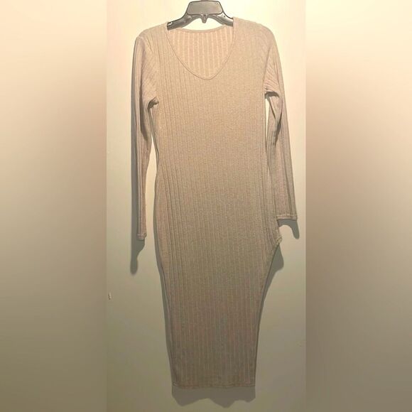 SHEIN- Maternity Cream V-Neck Ribbed Knit Split Thigh Long Sleeve Dress- Size L