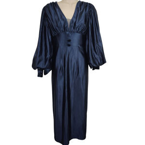 Full-length maxi skirt with beautiful drape and shine, puff balloon long sleeves with buttoned cuffs, zipper closure at back.