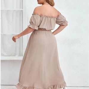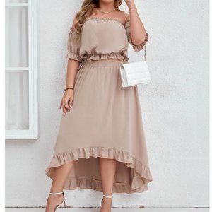 SHEIN size 22 (5X) Modely Plus Off Shoulder Frill Trim Top & High Low Hem Skirt in color Apricot. NEW never worn, kept past return date. Sold out online.