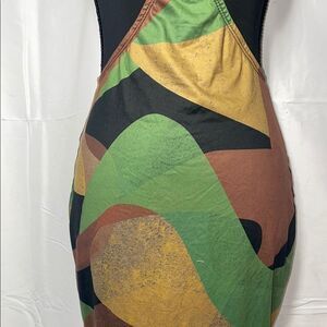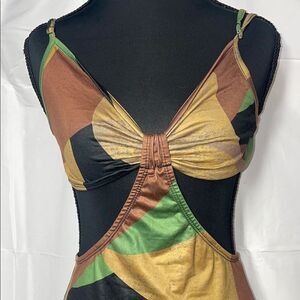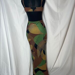 This stunning multicolor cutout maxi dress features a unique design with a blend of earthy tones. Perfect for making a statement at any event.