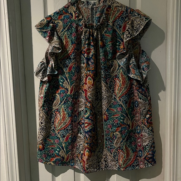 Floral top with intricate patterns. Features a blend of vibrant colors