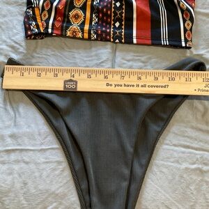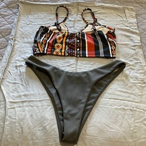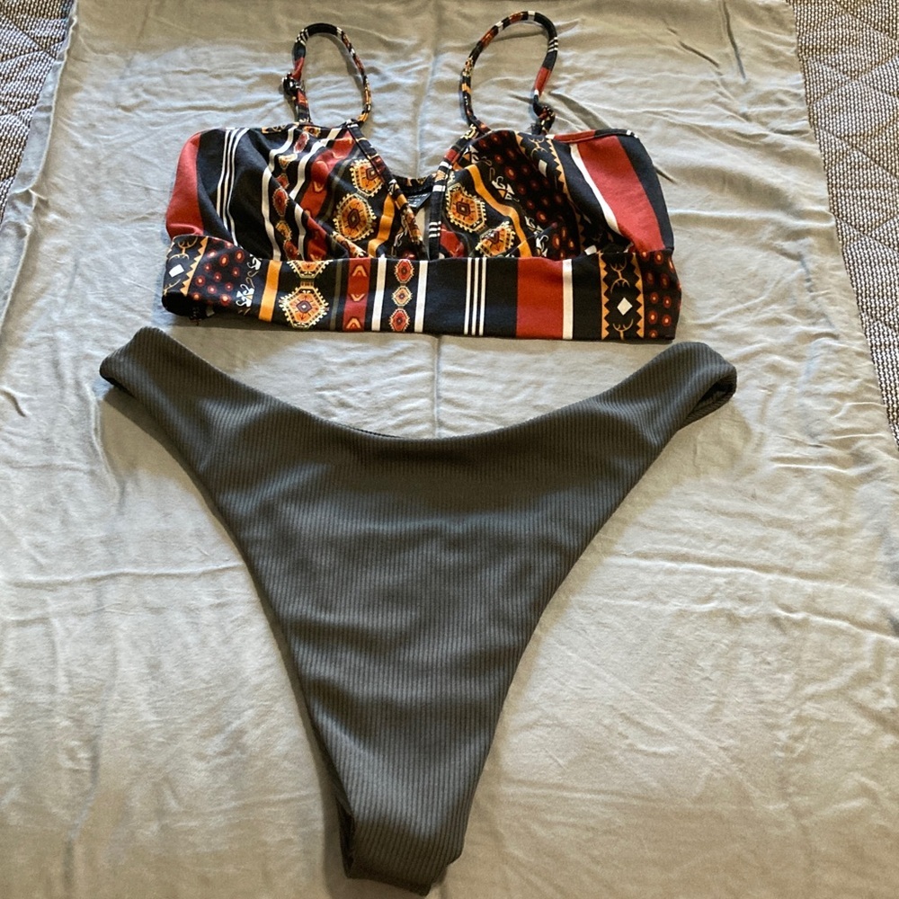 Stylish bikini with a vibrant patterned top. Solid dark bottom. Perfect for beach days.