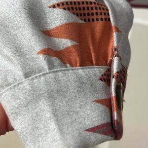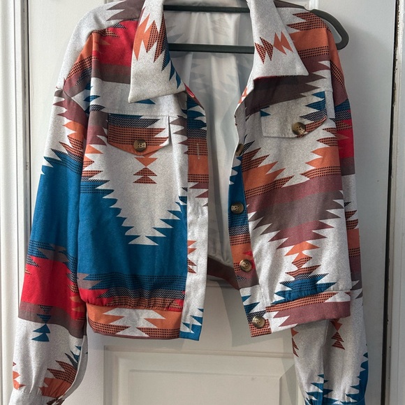 Chic jacket with multicolor geometric design. Features orange, gray, and cream tones. Perfect for a bold look.