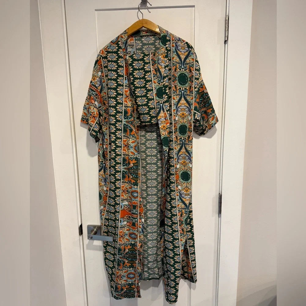 SHEIN Vibrant patterned robe and short set . Short sleeves. Open front design, used once for vacation.