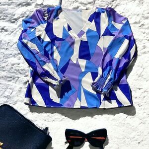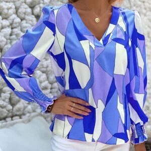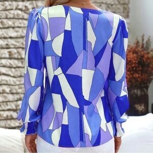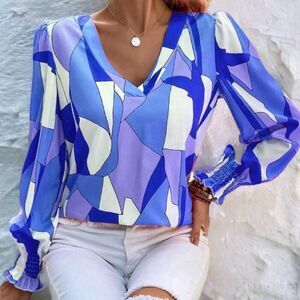 SHEIN NEW LUNE GEO PRINT LANTERN SLEEVES BLOUSE TOP BRIGHT BLUE LARGE