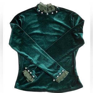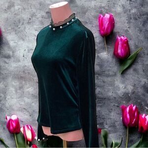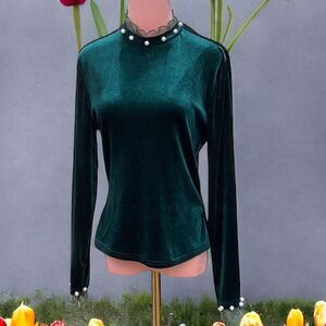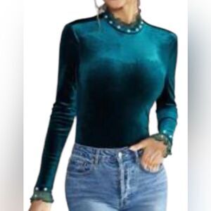 SHEIN NEW PRIVE PEARLS BEADED MOCK NECK EMERALD GREEN VELVET TOP BLOUSE LARGE