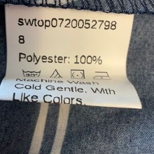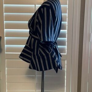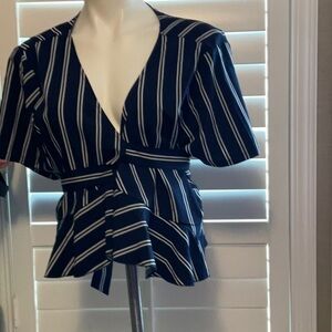 Stylish wrap blouse with navy and white stripes. Features a flattering fit and short sleeves. Perfect for casual or dressy occasions.