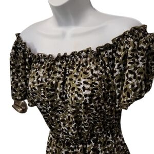 Elastic top allows you to wear this maxi on or off the shoulders. Lightweight with an elastic waist for a flattering and flowy fit. Olive green color.