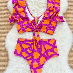 Dive into summer with the SHEIN bikini, featuring a striking blend of orange and purple hues. This stylish swimwear includes a plunging V-neck top with playful ruffled details and a high-waisted bottom for added comfort and coverage. Perfect for making a splash at the beach or poolside, this bikini combines fashion and function effortlessly.