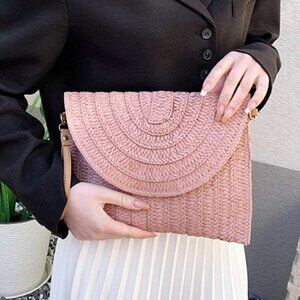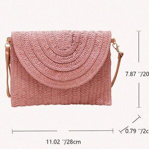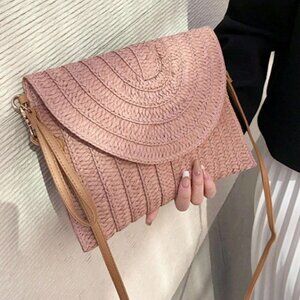 Stylish pink crossbody bag. Features woven texture. Perfect for any occasion.