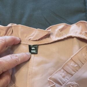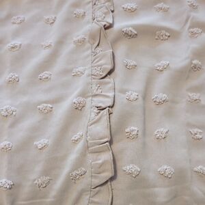 Chic pink blouse with ruffle details. Features delicate textured pattern. Perfect for casual or dressy occasions.