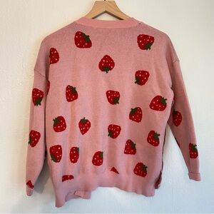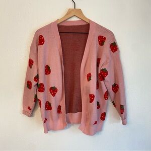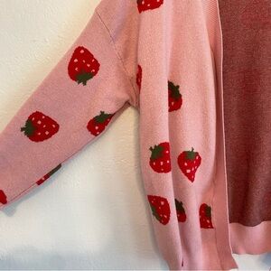 Playful pink cardigan with strawberry design. Perfect for casual wear. Soft and stylish.