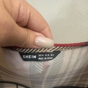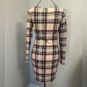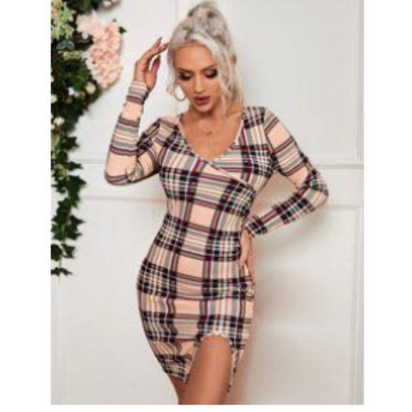 This stylish bodycon dress from SHEIN showcases a scoop neckline and cuffed long sleeves, perfect for a cocktail night out. The pink and black color scheme enhances the modern plaid design, while the stretchy fabric offers a flattering fit.
