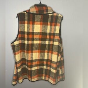 Stylish plaid sweater vest. Features orange, brown, and cream colors. Perfect for layering.