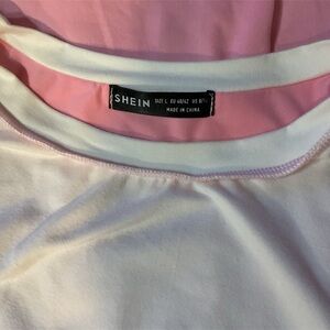 Shirt is pink and white and the seams are on the outside. New without tags in a size large.