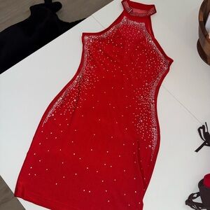 Dazzling red mini dress with sparkling rhinestones. Ideal for parties and nights out.