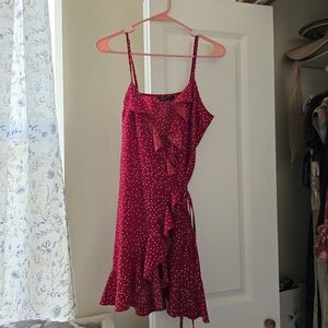 Chic red mini dress with playful polka dots. Features stylish ruffles and spaghetti straps. Ideal for casual outings.