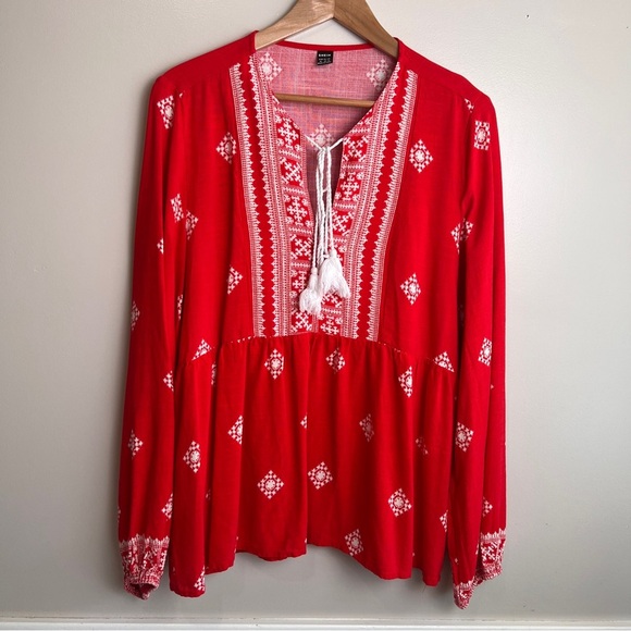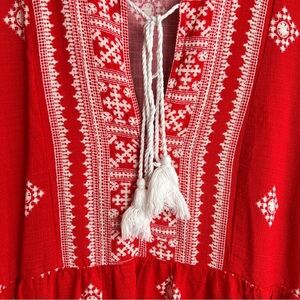 Vibrant red and white stamped embroidery print. Features tassel tie detail. Ideal for casual wear. Like new, no flaws.