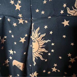 -one-way orange/gold sun and moon print on dark gray/black back ground