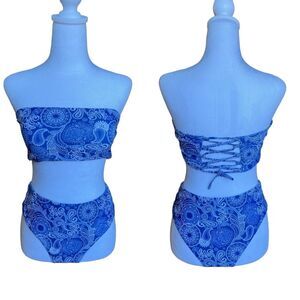 SHEIN Royal Blue Bandana Paisley Design Strapless Lace Back Bikini Size Small