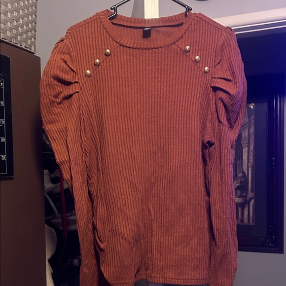 Chic rust ribbed blouse. Features stylish button details. Perfect for versatile styling.