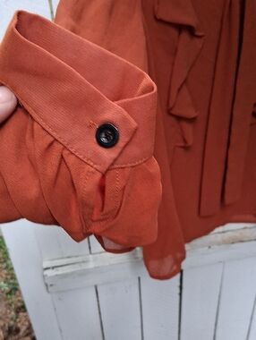 Lightweight rust blouse with cascading ruffles. Tie-front neck for a feminine touch. Long sleeves with soft ruffle cuffs. Easy to layer for day or evening wear.