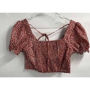 SHEIN Rust & White Floral Crop Front Cut Out Tie Puff Sleeves Cottage Top Size M