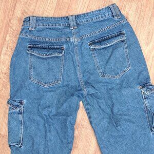 SHEIN SXY Regular Waist Cargo Denim Jean 90's Style Medium Dark Wash Misses Size Medium. Previously loved and gently worn. No flaws found. In great condition! 83% Cotton/16.5% Polyester/5% Viscose. Zipper with one button closure. Belt loops at waist. Two inverted pleat pockets with flap. Two side pockets. Two back pockets with flap. Wide leg. Measurements: Waist - 30", Front Rise - 9", Hip - 40" , Inseam - 30", Diameter at Leg Hem - 7".