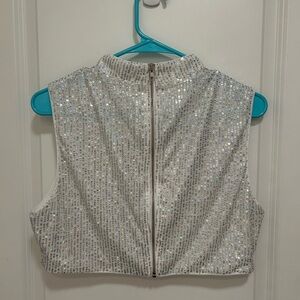 Never worn. Perfect for a bachelorette party. White crop top with mock turtleneck, sequins, and zipper back.