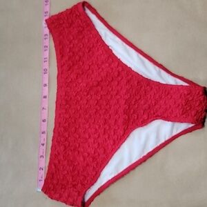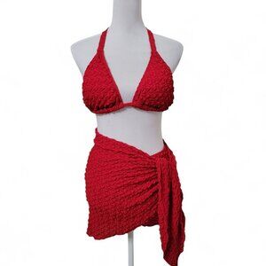 SHEIN Size XL Red Textured 3 Piece Bikini Set. NEW without Tags. Still has Hygienic Liner. Triangle Bikini Top with Tie Backs. HIgh Waist Bikini Bottoms. Tie Sarong. Please refer to measurements in photos to ensure proper fit. Note: Sarong is folded in half for photos so length is doubled what the photo shows.