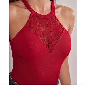 SHEIN Small Red Contrast Lace Cut Out in Front Ribbed Knit Halter Top Privé