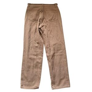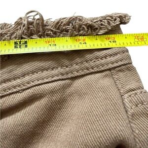 Stand out in these tan-brown denim jeans with raw-edge star patches and a frayed waistband. Straight leg fit with light stretch. Unique distressed star detail throughout. Waist measures approx. 15” flat, inseam approx. 26.5”.