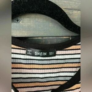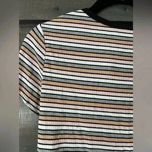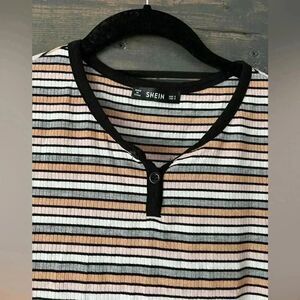 Keywords: crop top, striped top, ribbed, Y2K fashion, button detail, summer top, casual wear, SHEIN, neutral stripes, fitted top, short sleeve, retro style