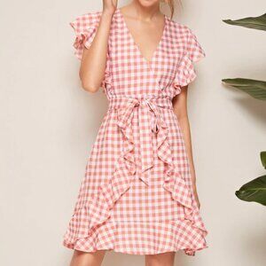 SHEIN | Surplice Neck Ruffle Trim Gingham Belted Dress