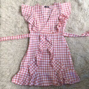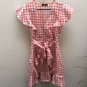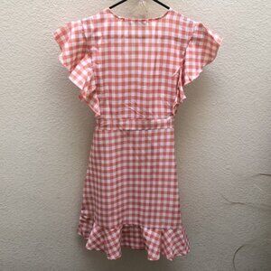 Used, good condition. Super cute. Women's coral pink and white gingham print ruffle trim belted dress. Deep V-neck, midi dress featuring ruffles through out dress. Flutter sleeves. Size: Small. Length: measuring from center back, 33 inches. Arm pit to arm pit: 16.5 inches. Side zipper.